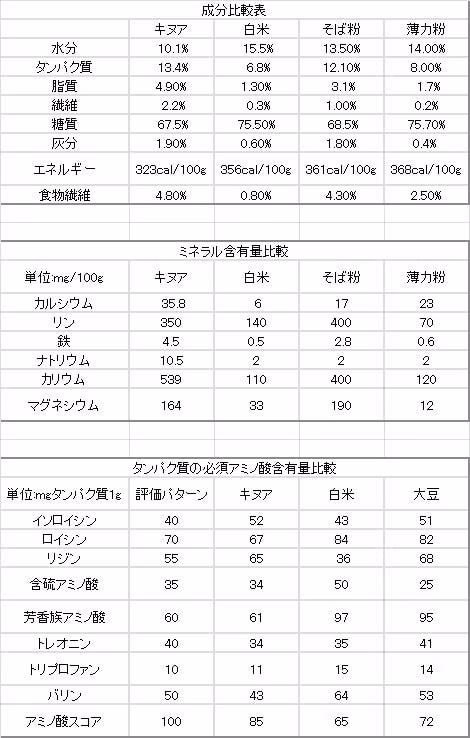 キヌアを米、小麦、大麦などの穀物と比較してみると、タンパク質は2倍~やや多い傾向を示す。更に、脂質は1.5~3倍、食物繊維は2~10倍、灰分は2~8倍。一方、デンプンなどの糖質は3/4程度の含有で、全体的に極めてバランスの取れた一般栄養成分を持つことが分かる。